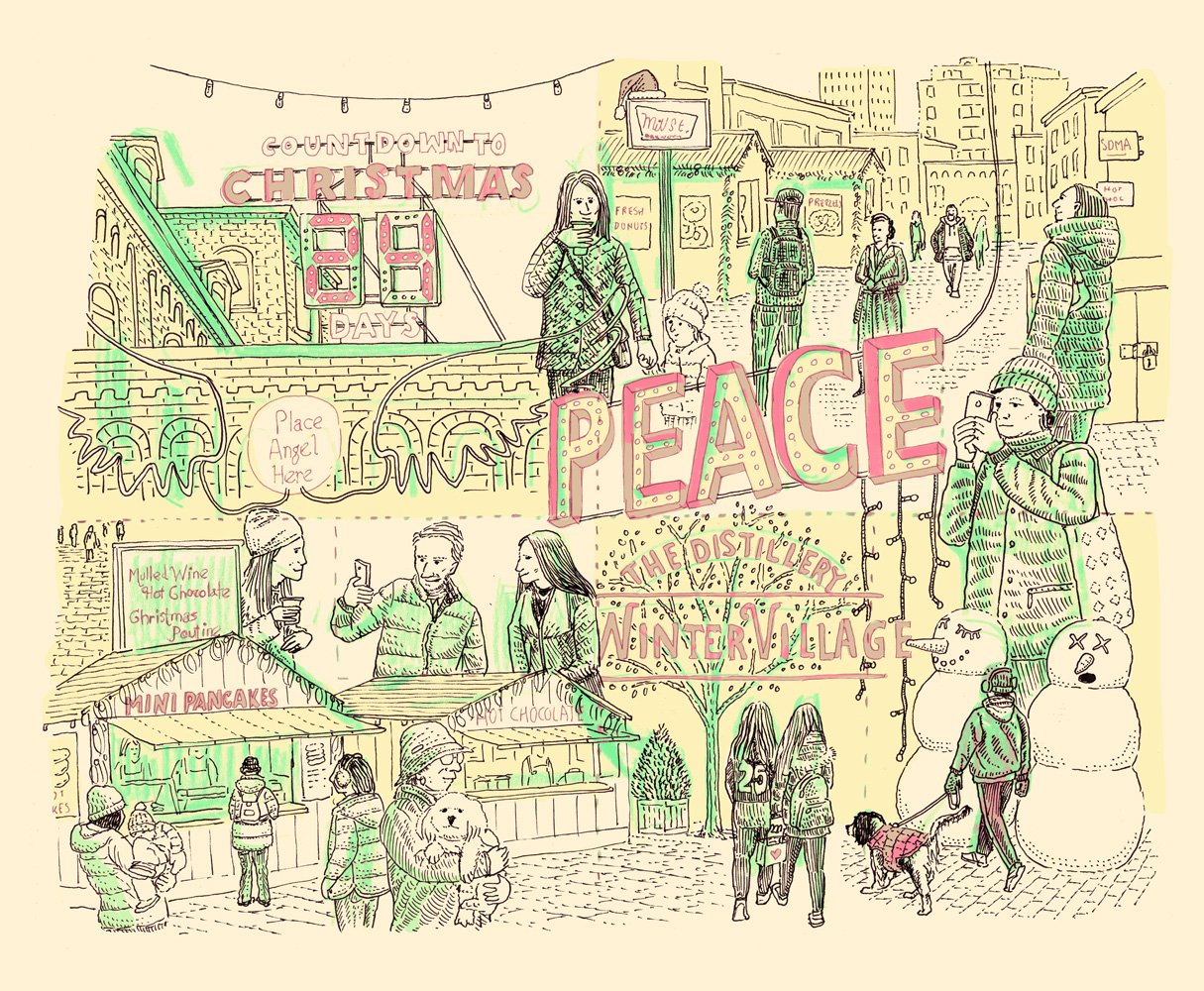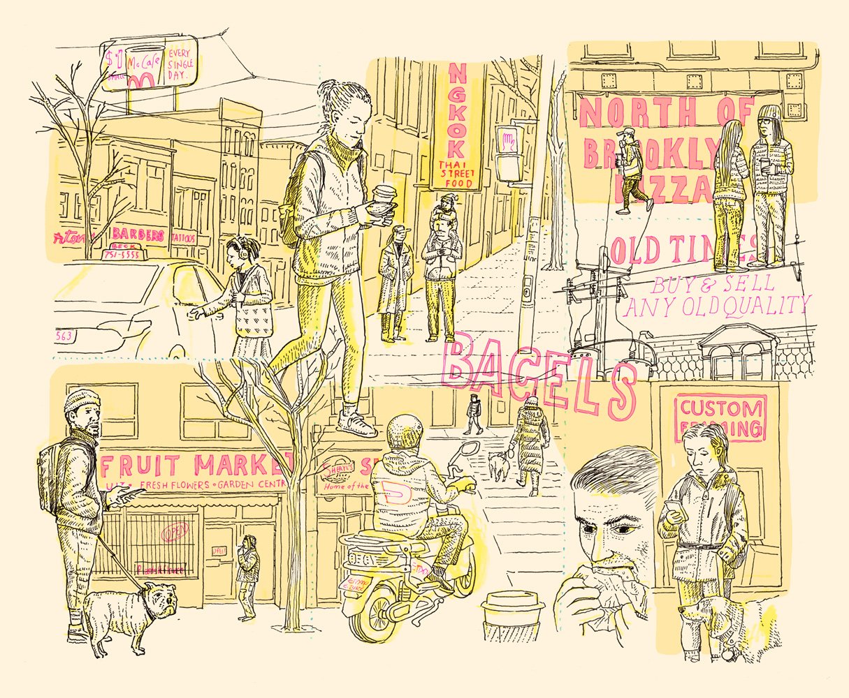 Print the collage as reference for a free-hand sketch, using markers, pencils and fine-liners.